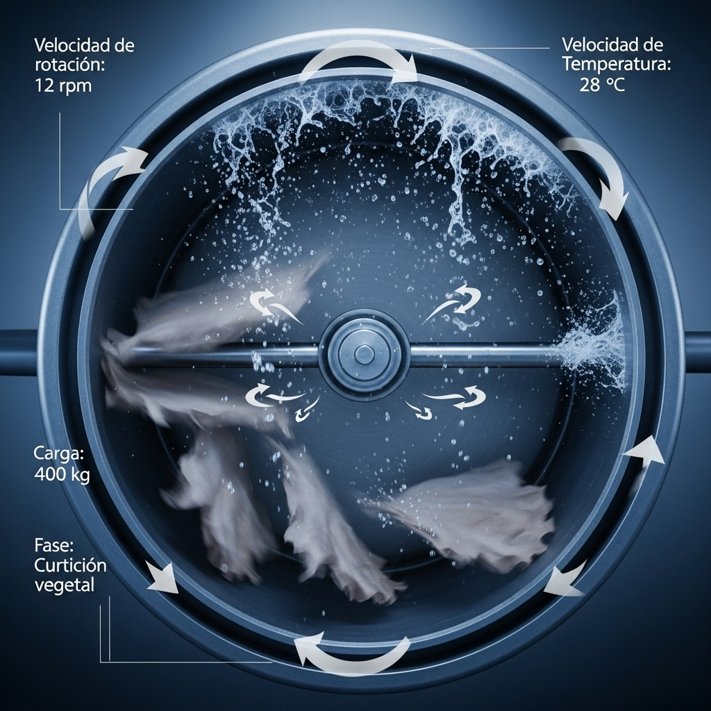 Los bombos, construidos con materiales como madera, resina poliéster o acero inoxidable, trabajan bajo un mecanismo de golpeo constante que, en combinación con agua, productos químicos y un control adecuado del pH, convierte las pieles en cuero.