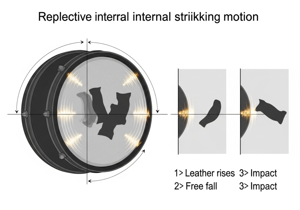 En contraposición al bombo, la Enigma 2040 utiliza un sistema de retorcimiento controlado por mordazas electromecánicas que sujetan las pieles y las manipulan de forma precisa. Este método suprime el golpeteo constante, asegurando un tratamiento uniforme de las fibras.